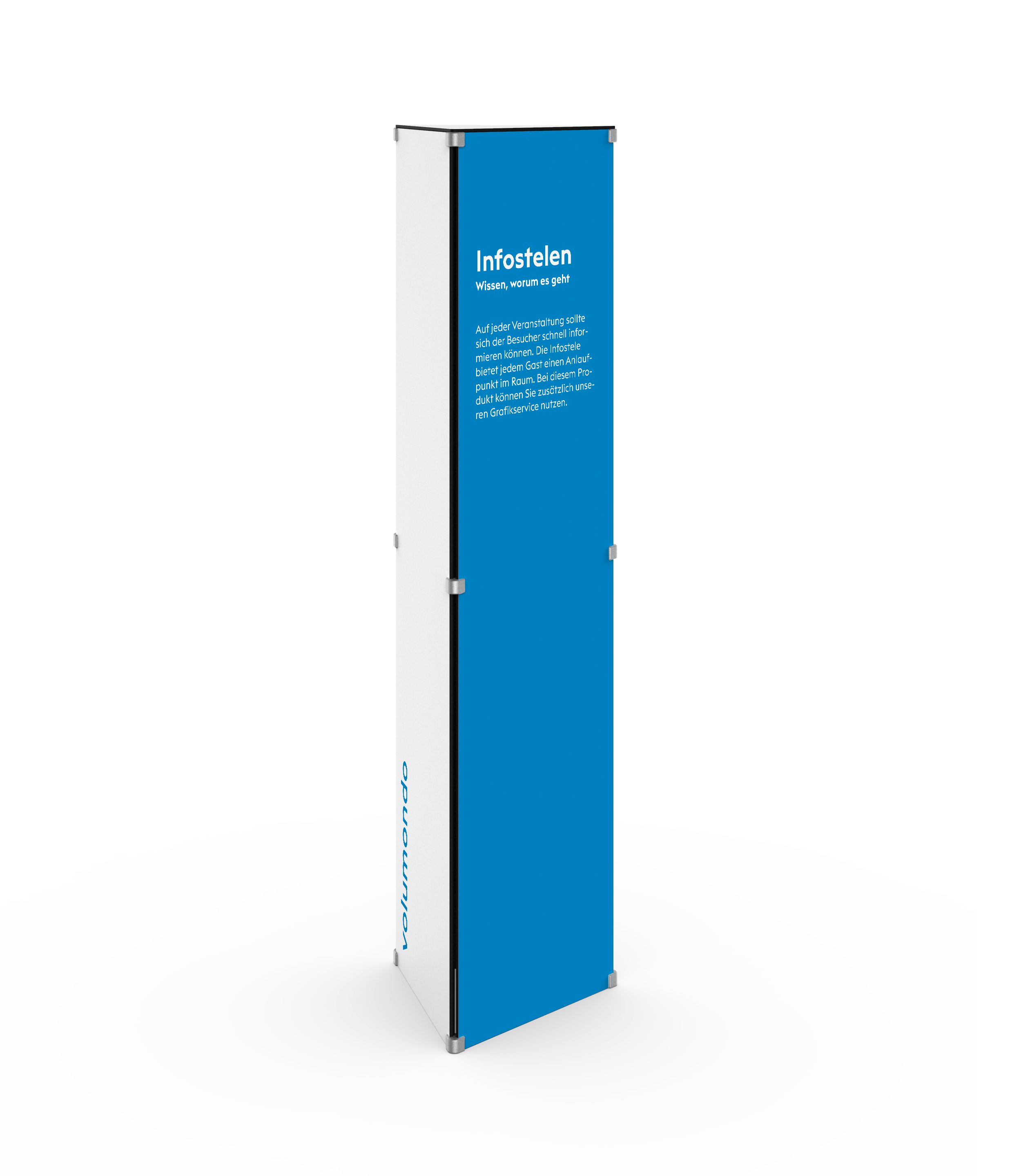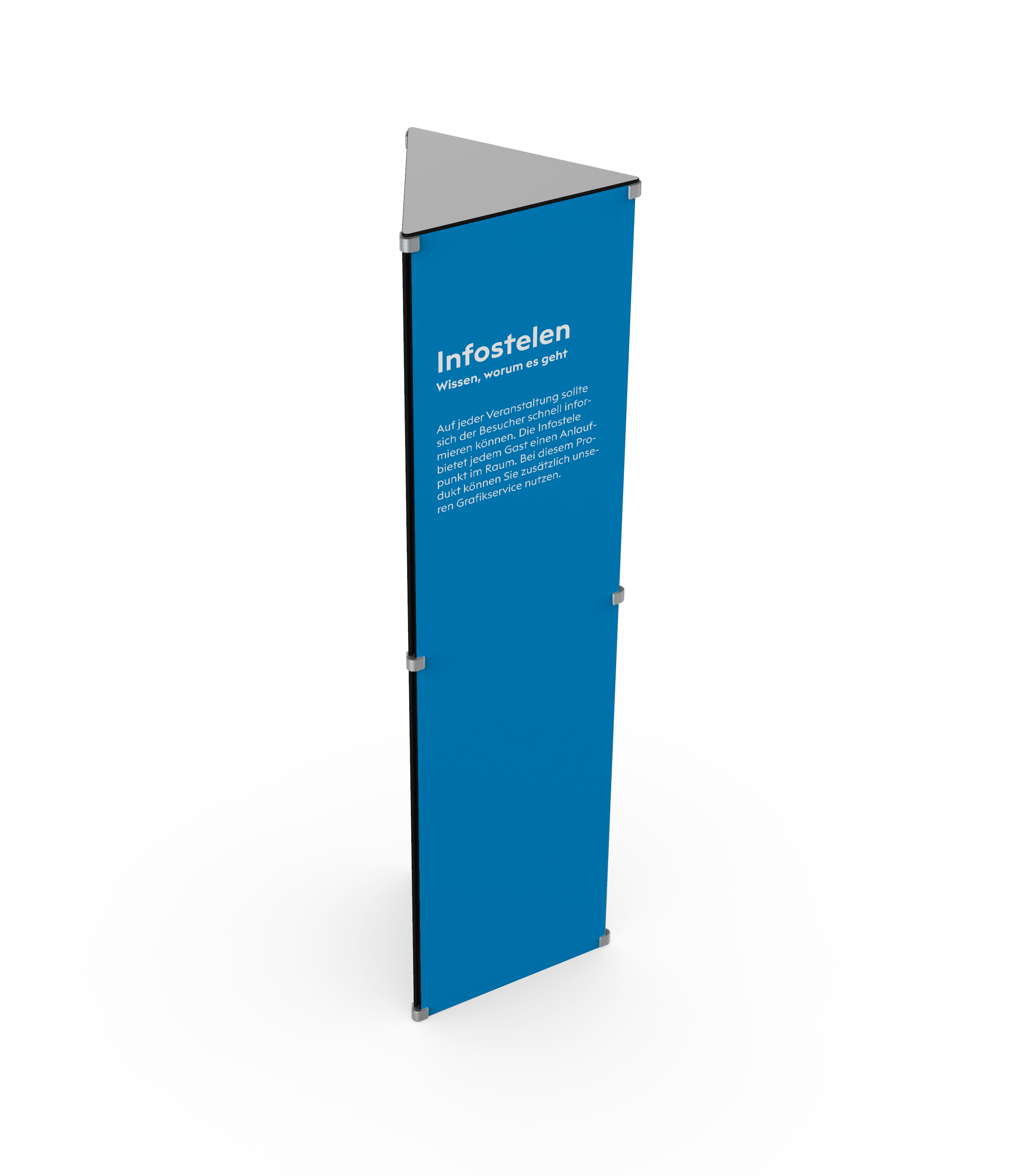 Auf jeder Veranstaltung sollte sich der Besucher schnell informieren können. Die Infostele I bietet jedem Gast einen Anlaufpunkt im Raum. Bei diesem Produkt können Sie zusätzlich unseren Grafikservice nutzen.