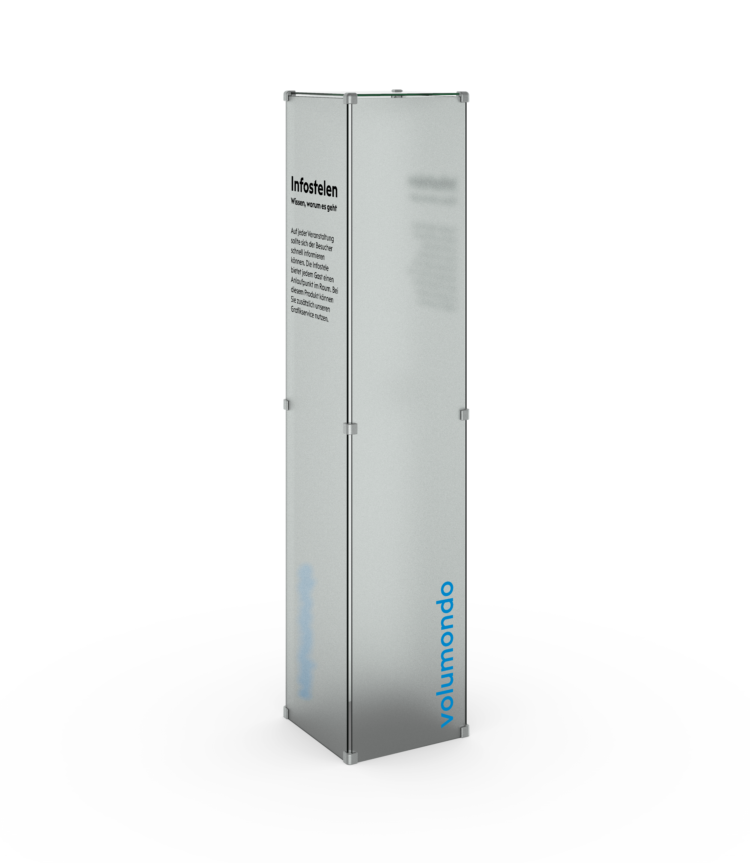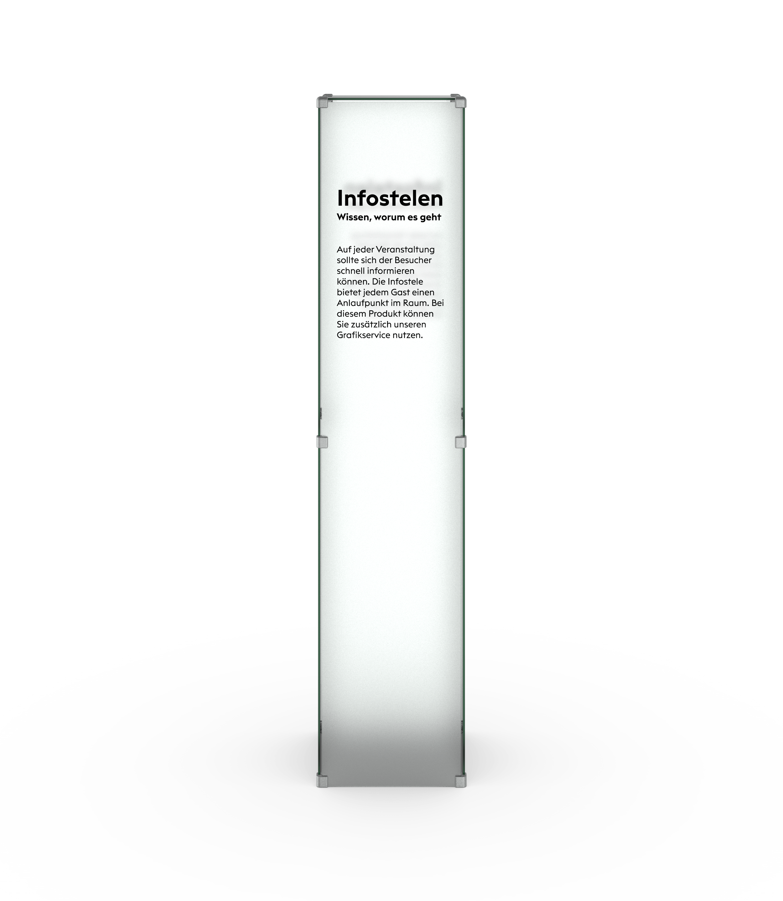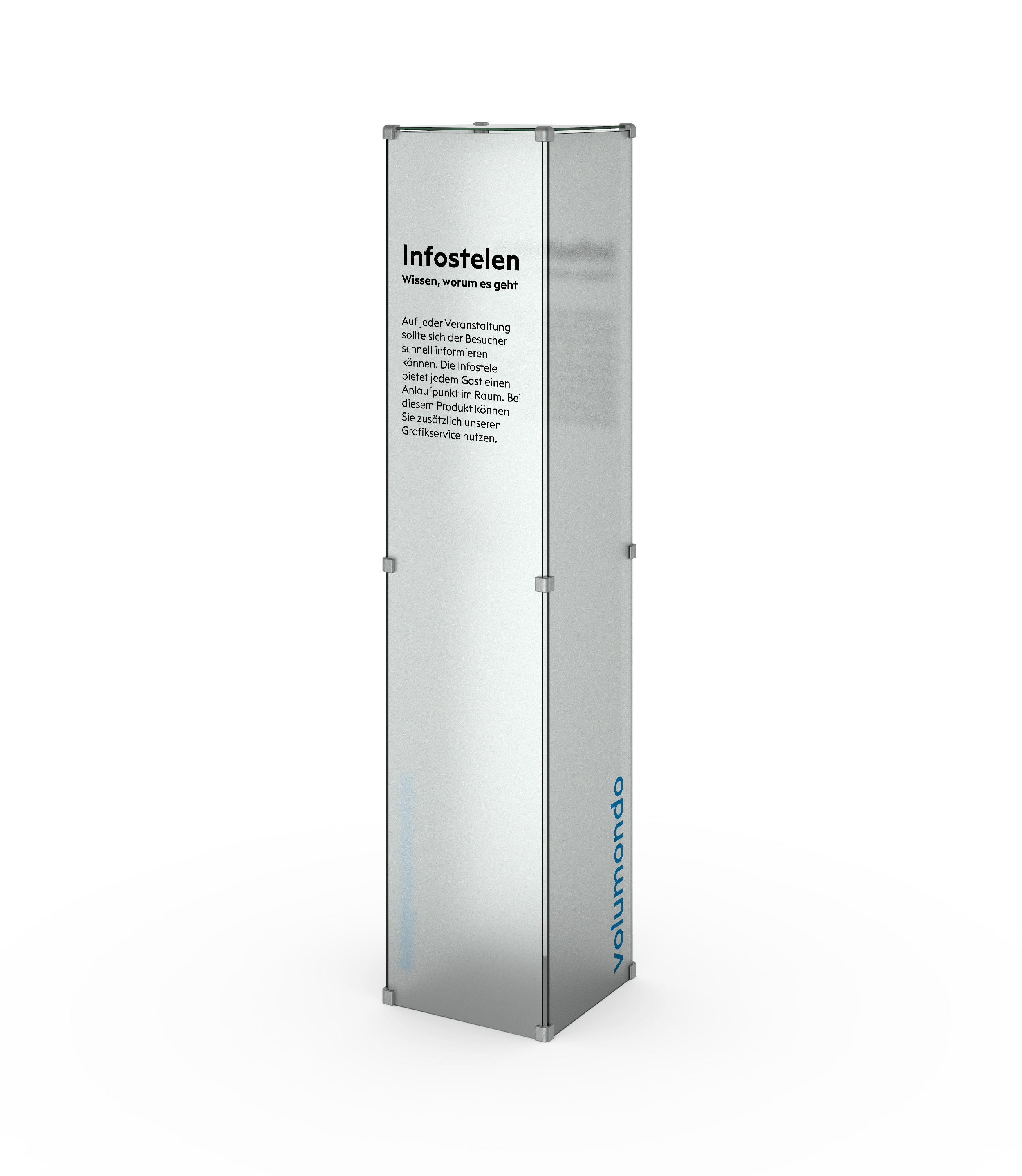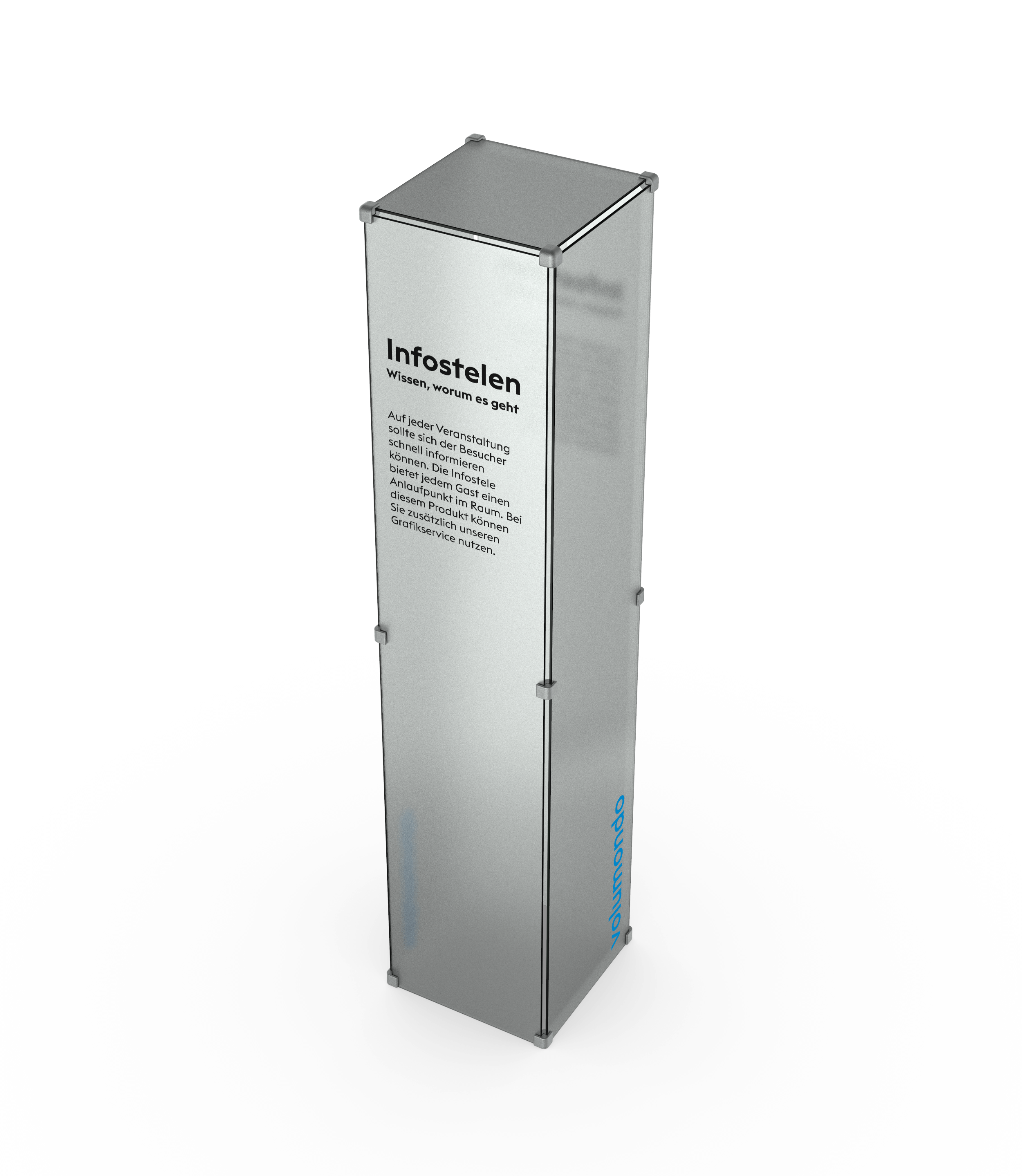 Gerade bei größeren Events und Messen kann sich der Besucher schnell orientierungslos fühlen. Nicht so mit unserem Produkt — die Infostele III ist deutlich erkennbar und bietet Unterstützung bei der zielgerichteten Entdeckung. Ob Sie ein Leitsystem zeigen oder die Geschichte Ihres Produkts veranschaulichen — hiermit wird Ihnen die Kommunikation gelingen.