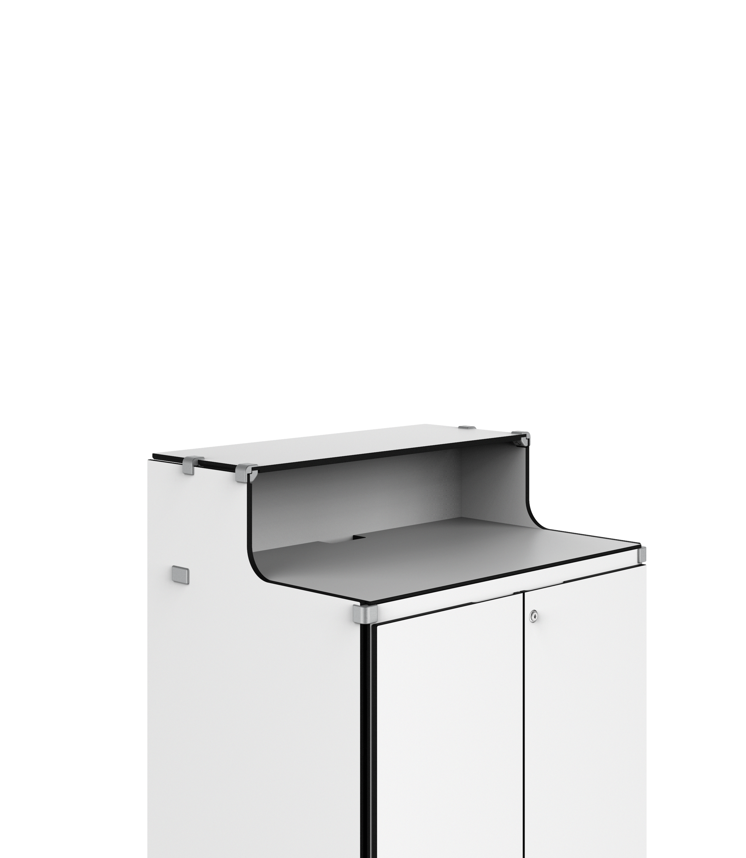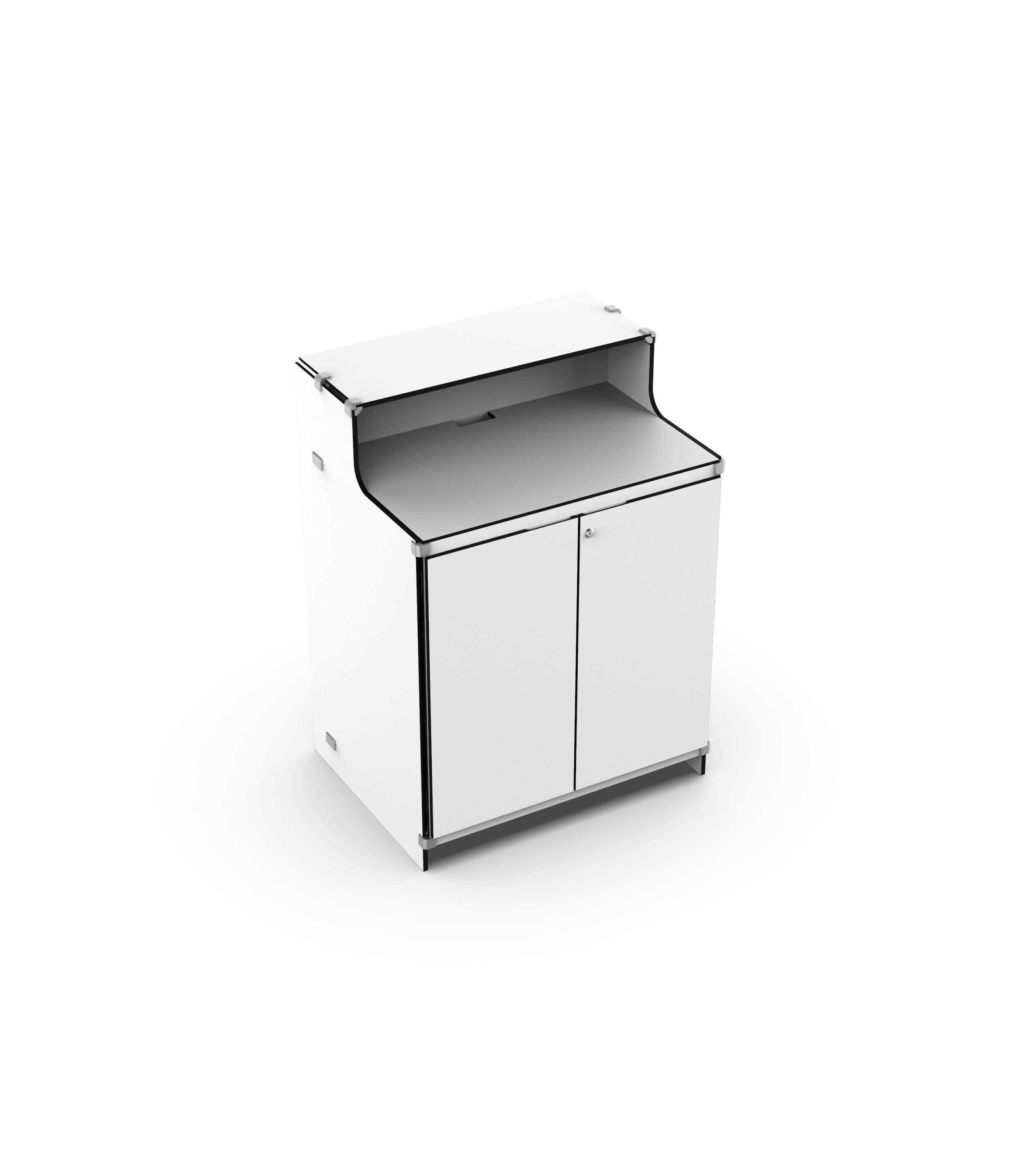 Mit höhenregulierbaren Ablagefächern setzen Sie auf intelligente Kapazität, die keinen Platz wegnimmt. Der Stauraum sieht zwei Kabelführungen vor, die Ihnen das Aufladen von  Smartphones oder die ständige Nutzung von Laptops im Arbeitsbereich ermöglichen. Das Verstauen von gängigen Prospekten und veranstaltungstypischen Artikeln wurde bei der Herstellung  bedacht.