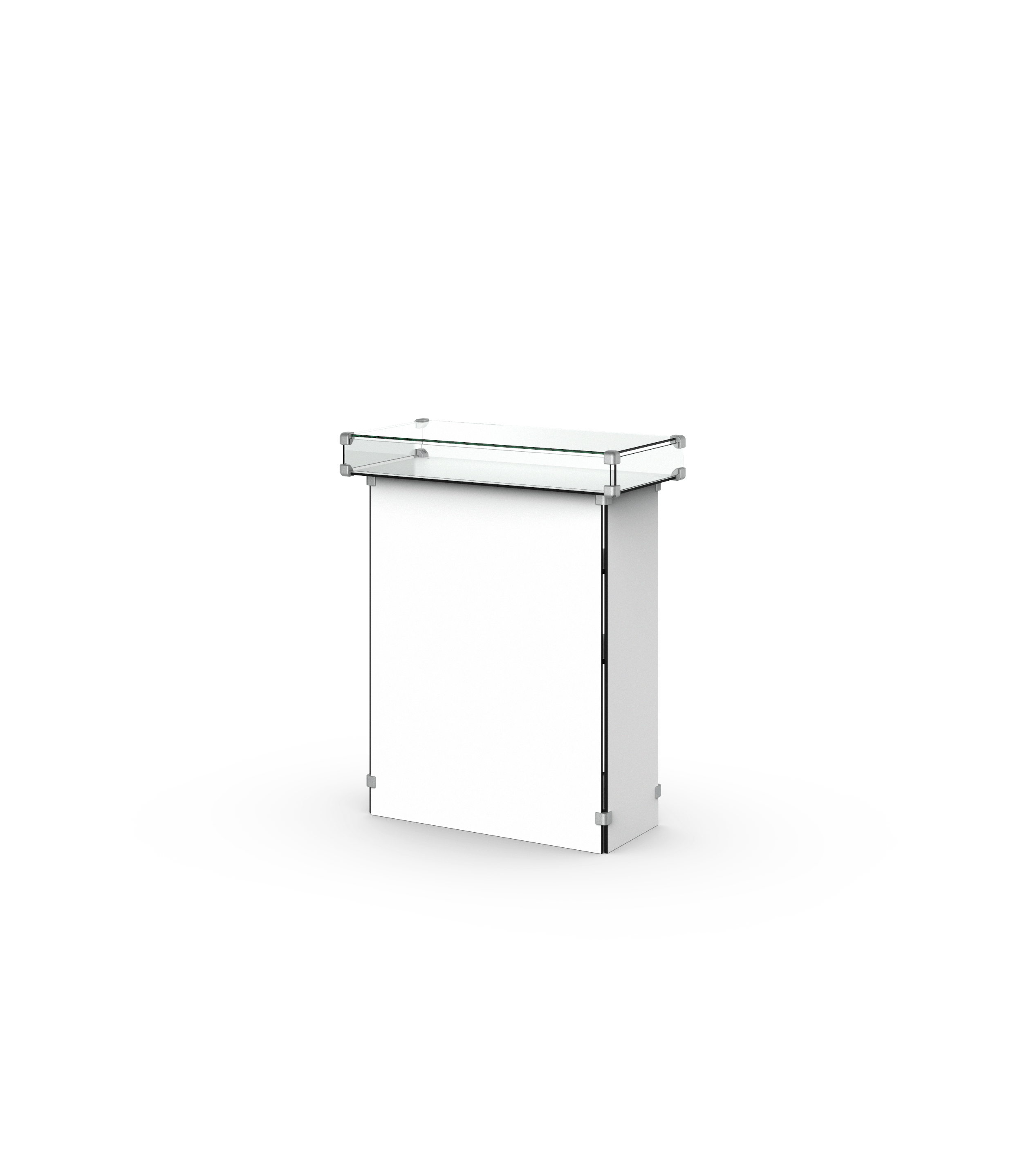 Der Verkaufstisch II 800 setzt sich zusammen aus Glas, CDF und Verbindern. Gerade mal zwei Werkzeuge genügen für einen spielend leichten Auf- und Abbau — schnell und einfach steht das Produkt im Raum und Ihre Produktpräsentation kann beginnen.